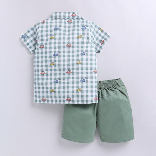 Checkered Car Print Shirt with Solid Shorts - Green