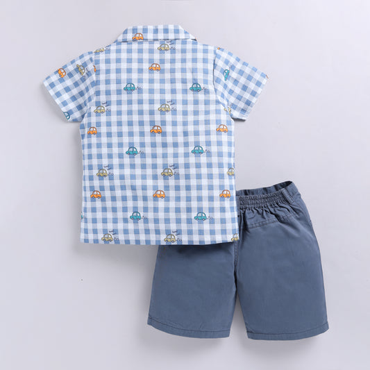 Checkered Car Print Shirt with Solid Shorts - Blue