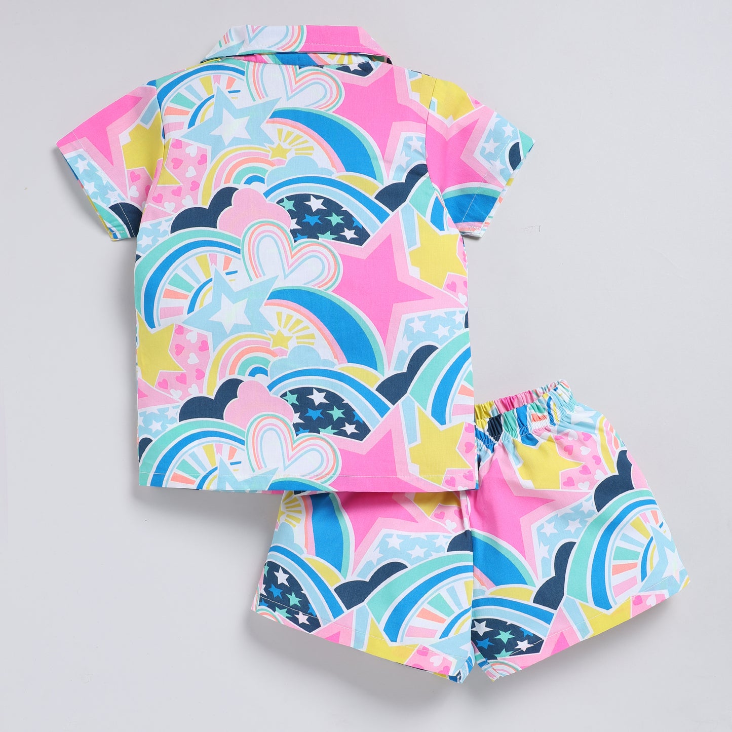 Dress your little one in the ultimate summer comfort with our adorable baby girl's pink and blue top with shorts set featuring a delightful star and rainbow print