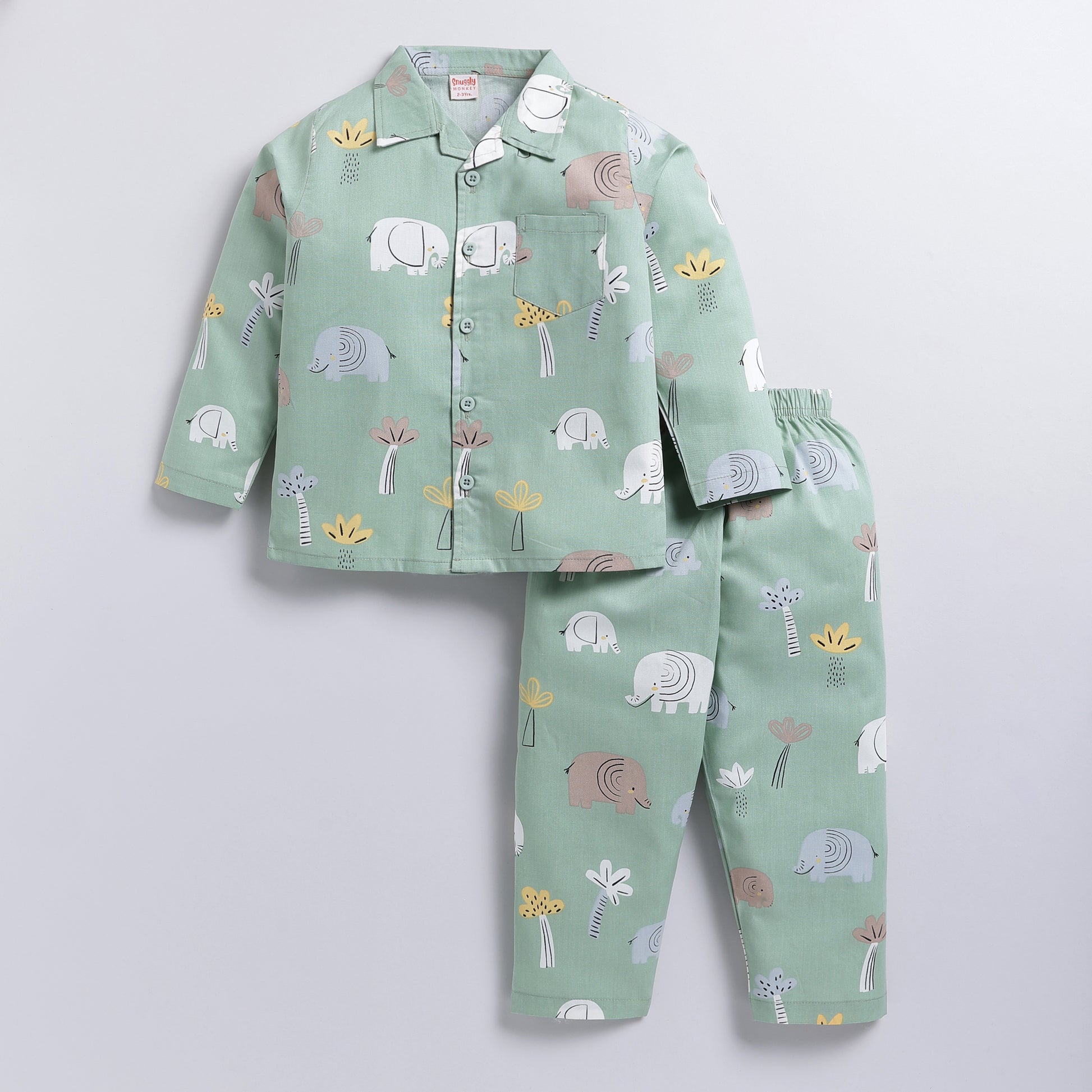 Elephant Safari Print Cotton Nightsuit Set - Green ( 9-12M to 5-6Y)