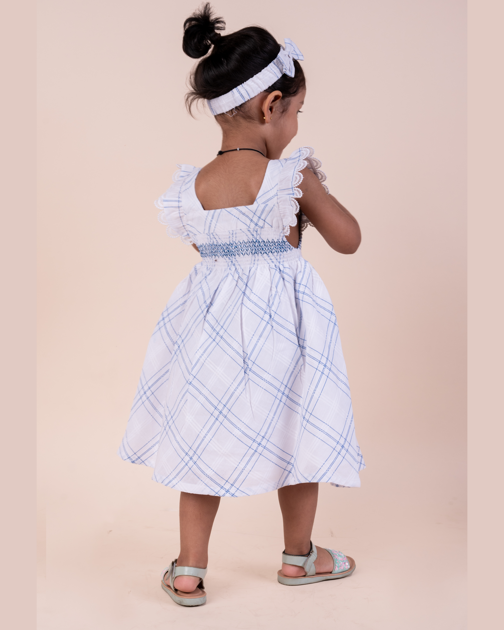 Introducing the perfect addition to your little girl's wardrobe: a charming baby girl's dress featuring a delightful blue and white plaid pattern with a matching hairband. This dress combines classic style with a playful touch, making it ideal for any occasion, from family gatherings to casual playdates.
